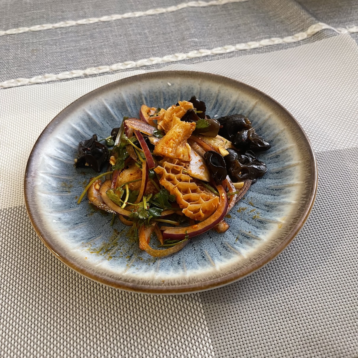 牛肚(金钱肚) 木耳 紫洋葱 香菜 葱姜蒜 干辣椒 花椒 红油 香油
